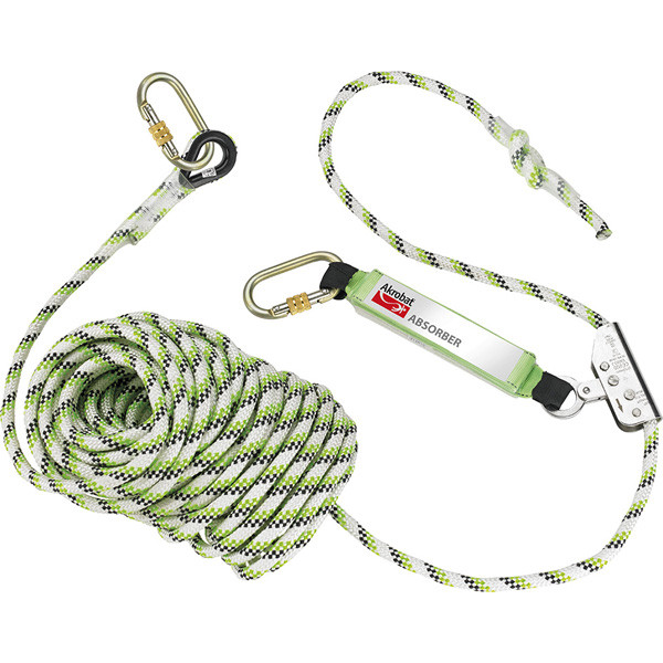 Dispositivo anticaduta scorrevole non apribile, fornito con 2 moschettoni, dissipatore e fune da 20 metri. Consigliato per scale e piani inclinati.